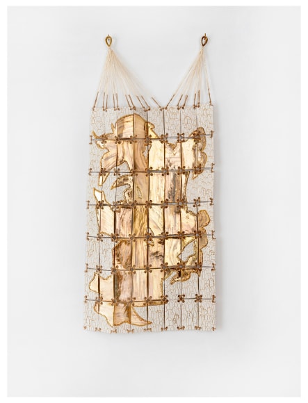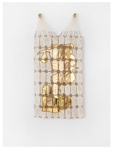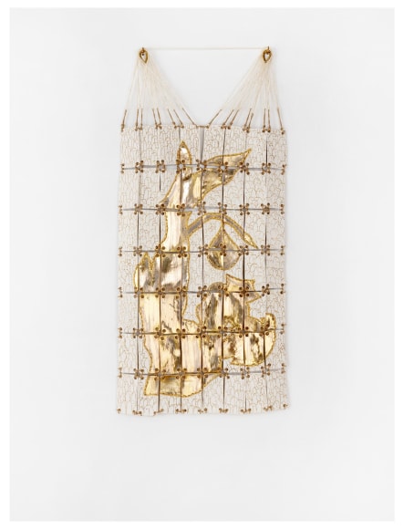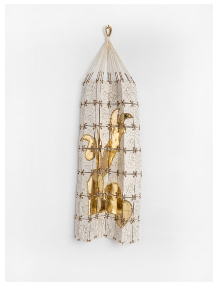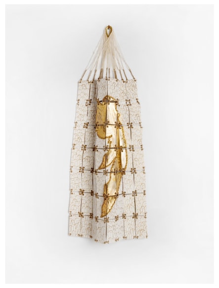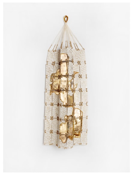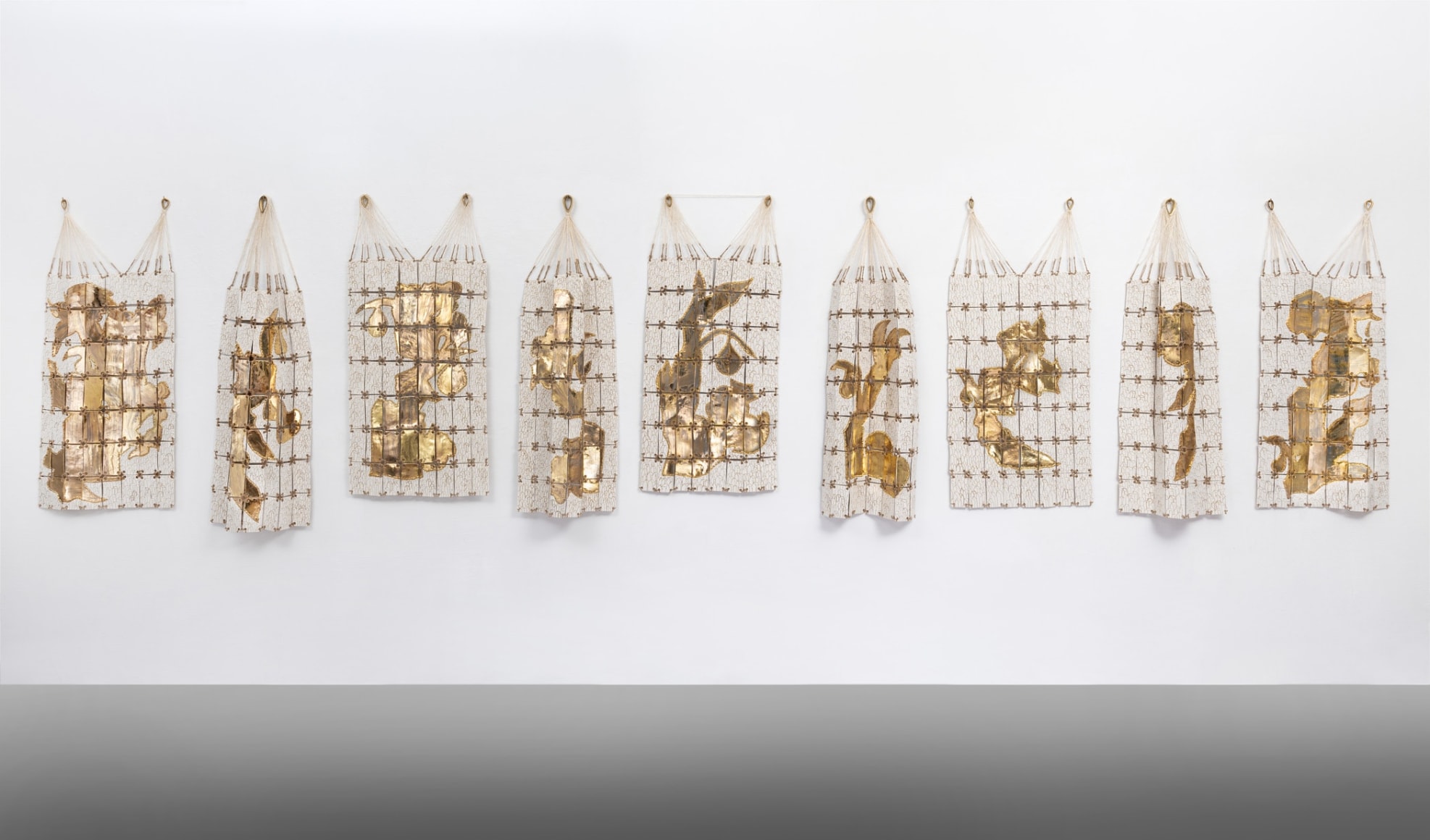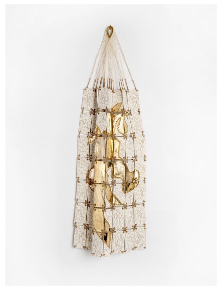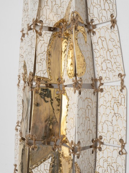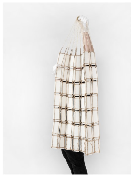 Each work in this series is made by carving patterns onto unfired thin porcelain tiles which are then painstakingly sewn into with slip-soaked thread. The small tiles, once fired, glazed and lustered, are then joined together with twine and hundreds of hand-tied knots.