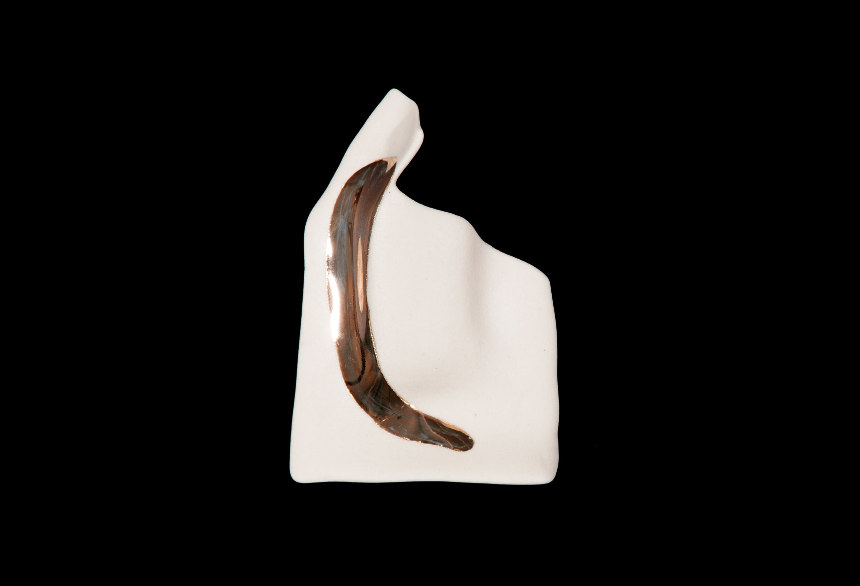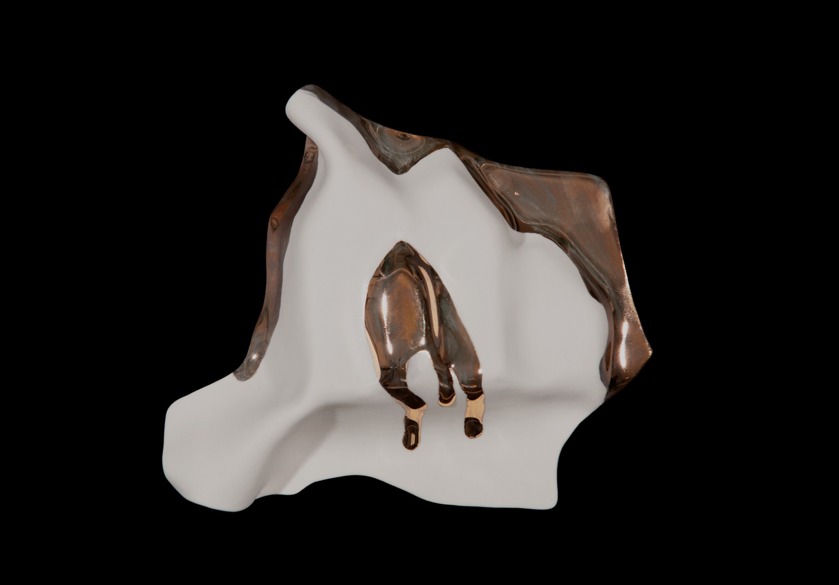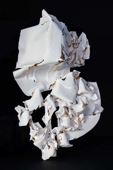 The Cover/Uncover, Unhidden series explores ideas of community, intimacy and relationships. Using simple house forms as anthropomorphisms, draped porcelain shrouds clusters of these simple house figures, implying a level of remove, a layer or protection and an intimate privacy in the hidden spaces behind the sculpture. The use of pooled glaze painted with 24k gold luster is used to add suggestions of worth and unpredictability inherent in interpersonal relationships.