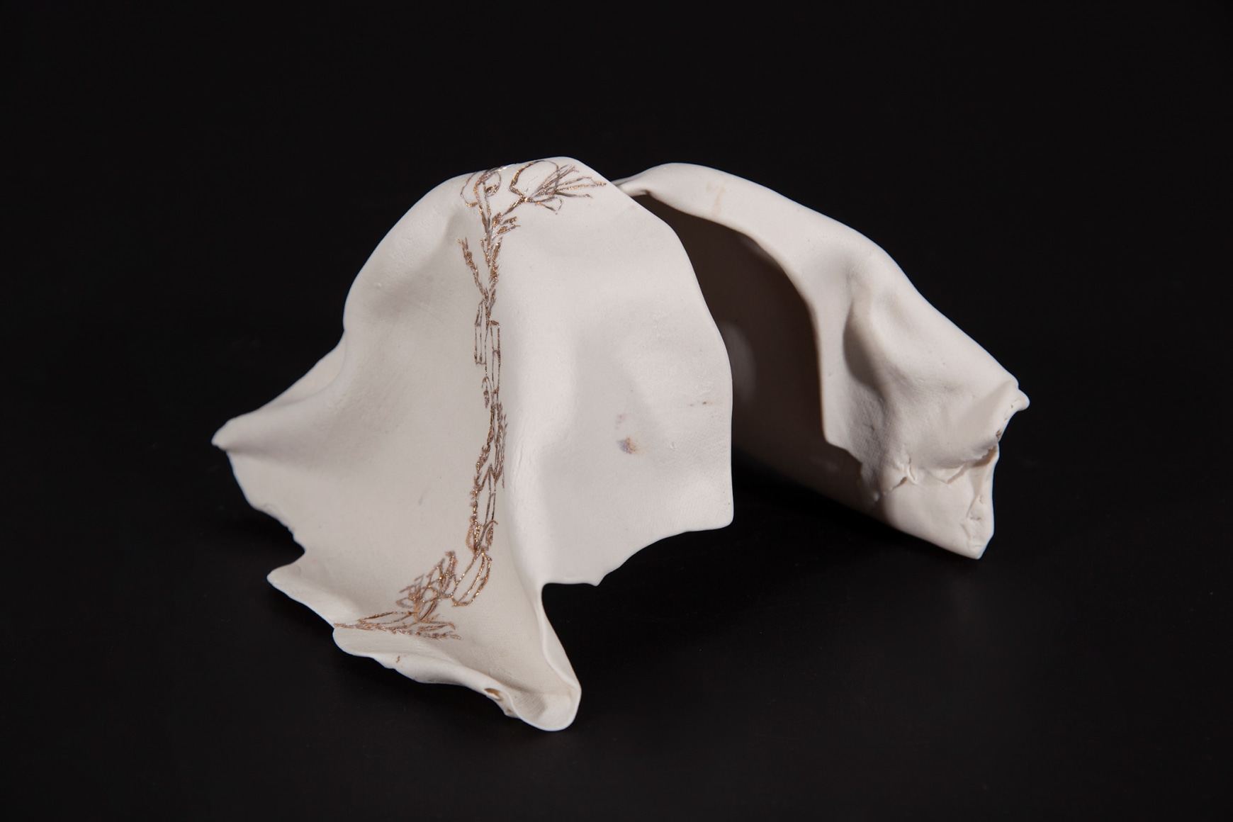 Sculpture series made from thin slabs of fragile wet clay. Once fired, these abstracted forms that are both draped and structural reflect the fragility of the individual and the necessary yet uncertain protection of home and shelter.