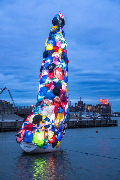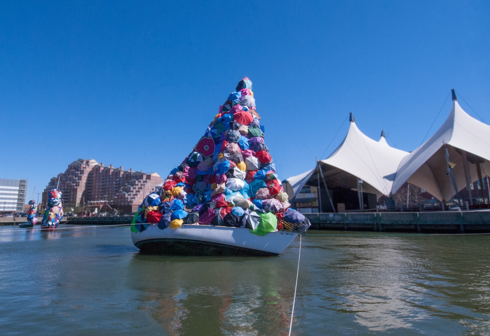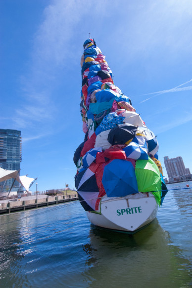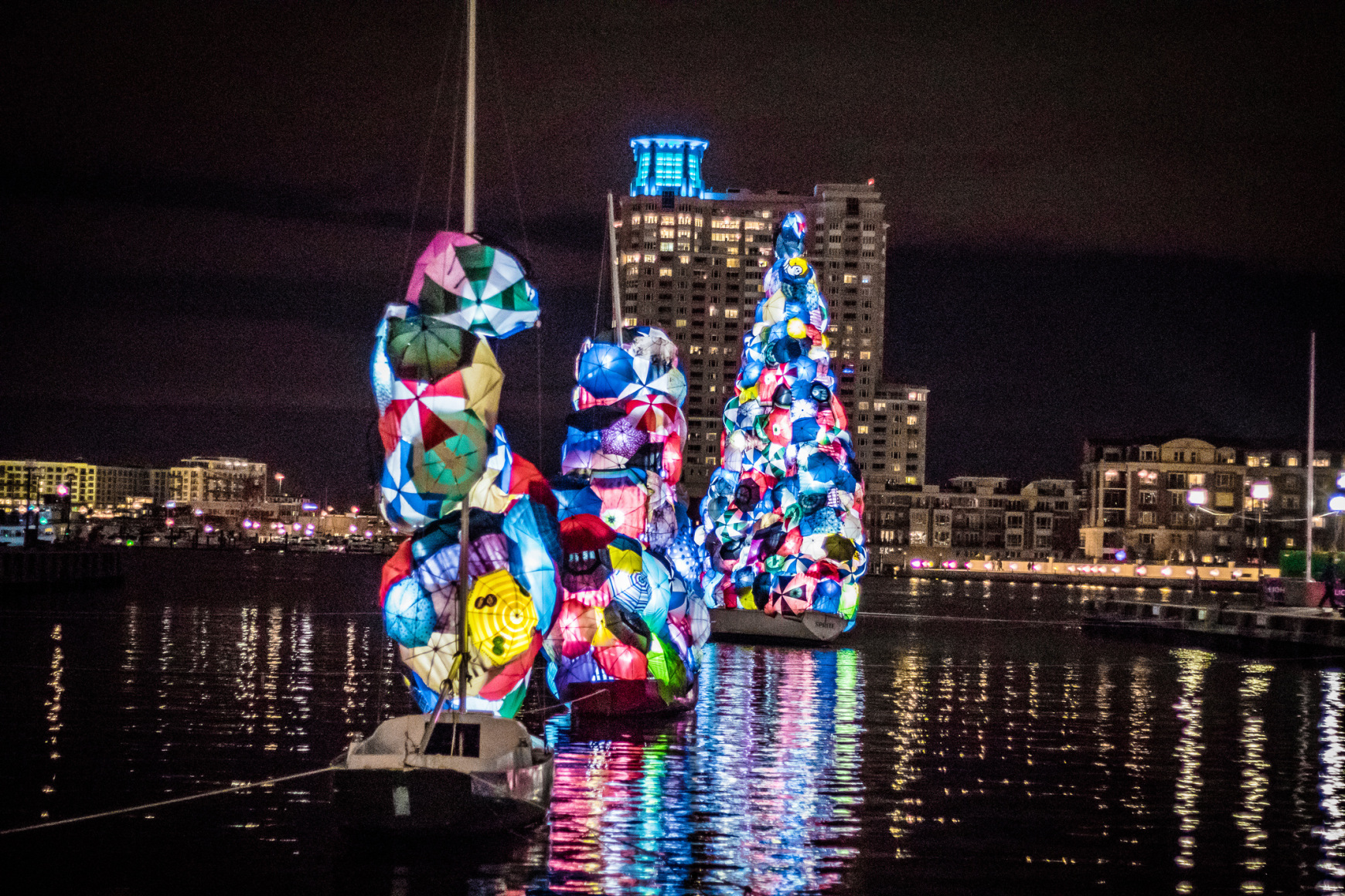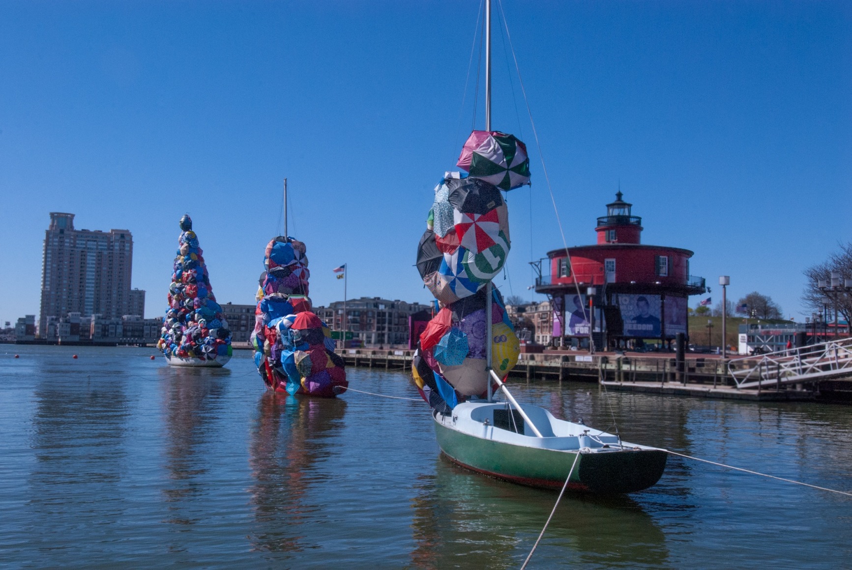 A site-specific installation covering three sailboats with umbrellas celebrating the importance of community and the fragile beauty of individuals.