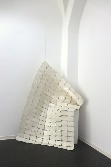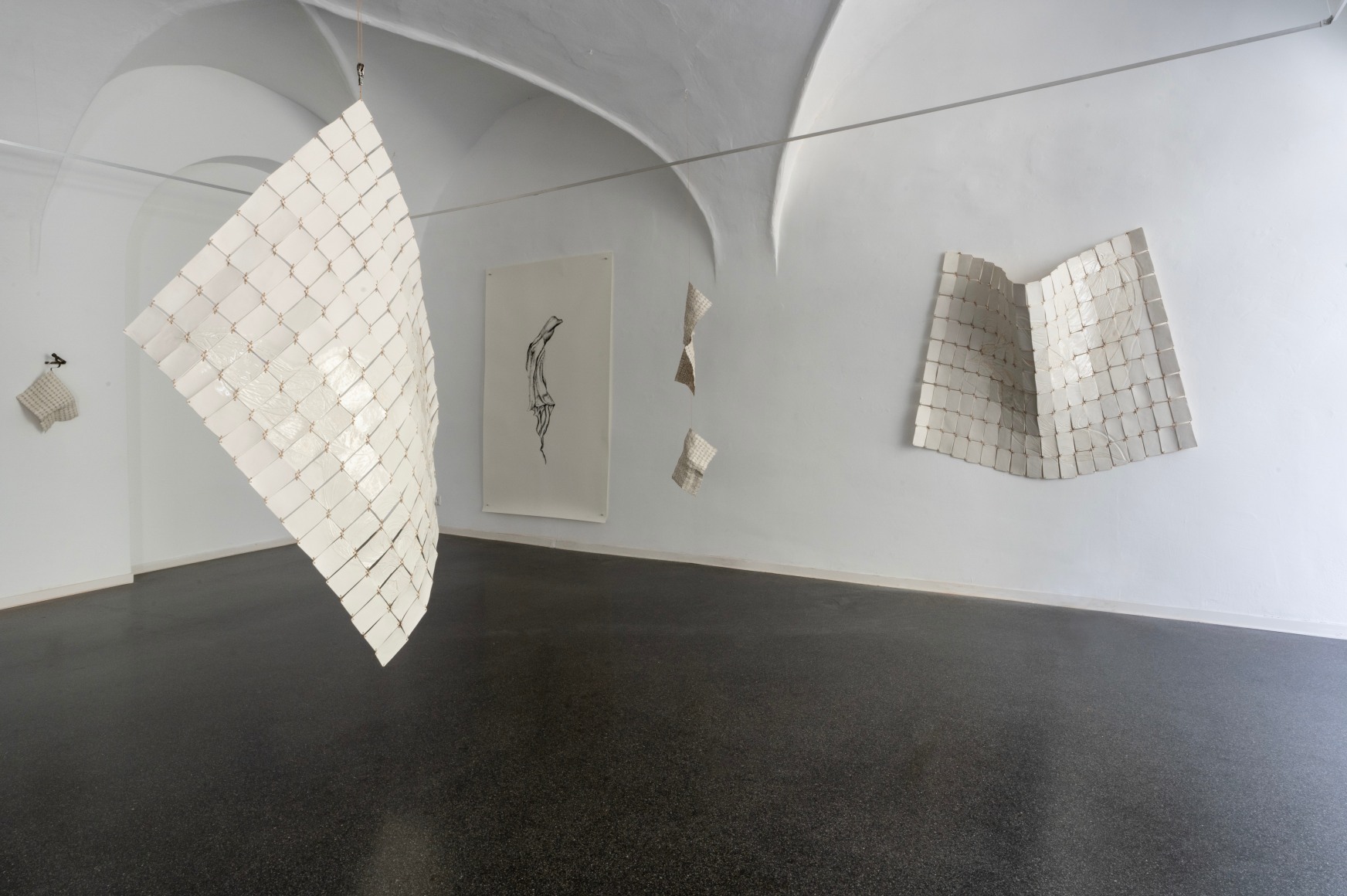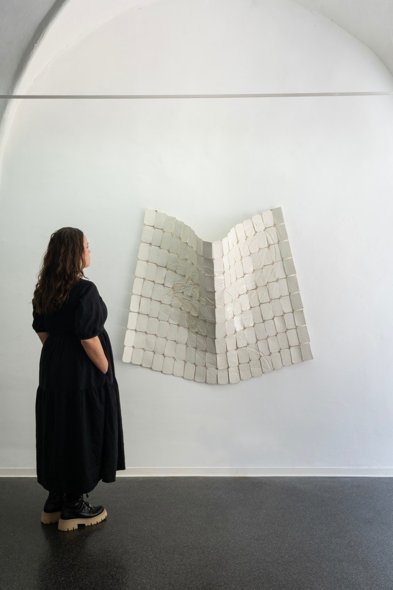 Porcelain to Meissen is both the title of Stephanie Imbeau’s 2024 residency exhibition at Kunstverein Meißen and the name of a central body of work created during that time: four large-format "sewn porcelain" panels composed of hundreds of hand-cut tiles, bound together with over 100 meters of braided polyester rope. These works, made with porcelain tiles transported from Berlin to Meissen, merge ceramic and textile techniques to explore themes of connection, labor, and the tension between fragility and strength. Their creation was a communal process, developed through open workshops with local participants where making and conversation were interwoven.