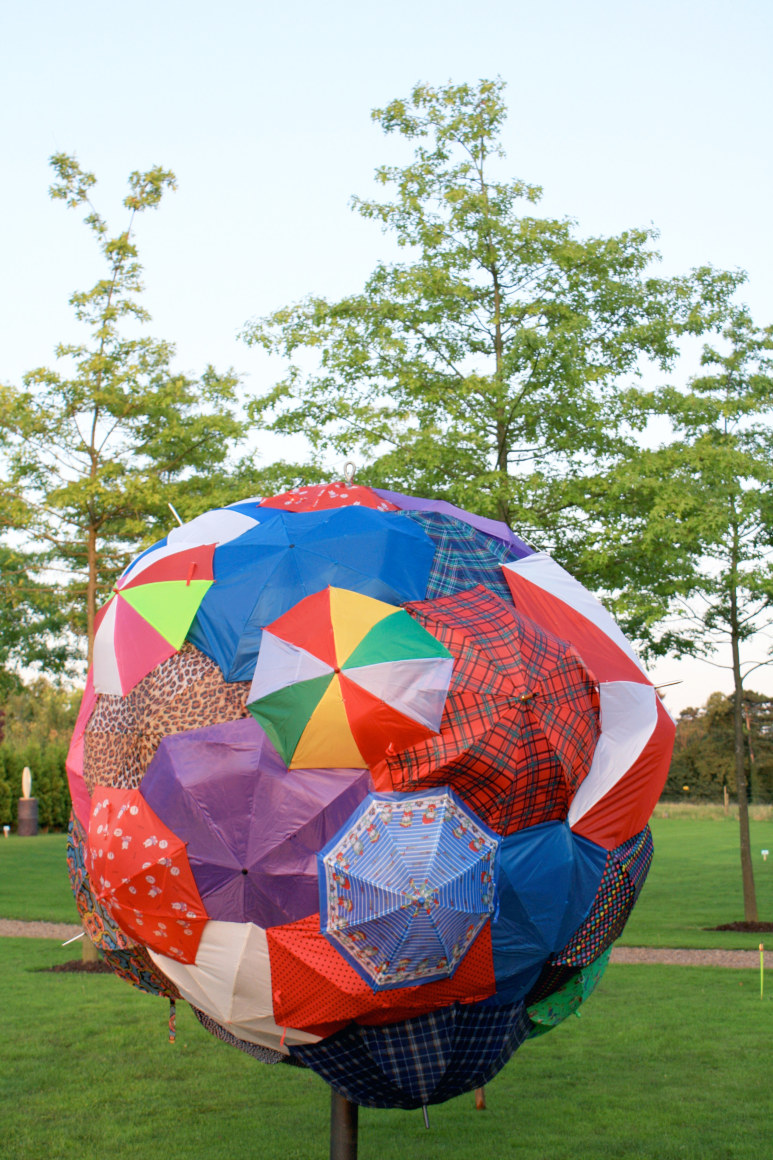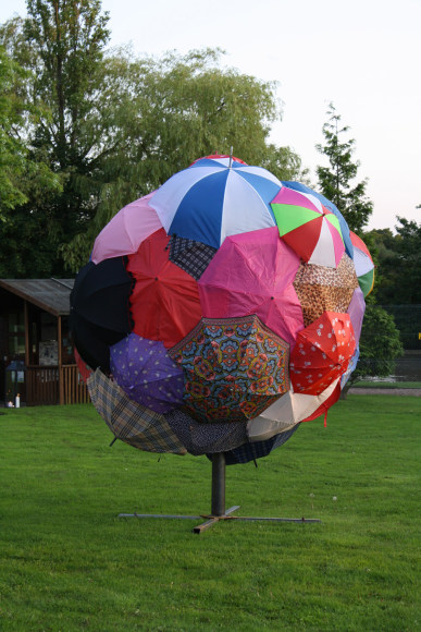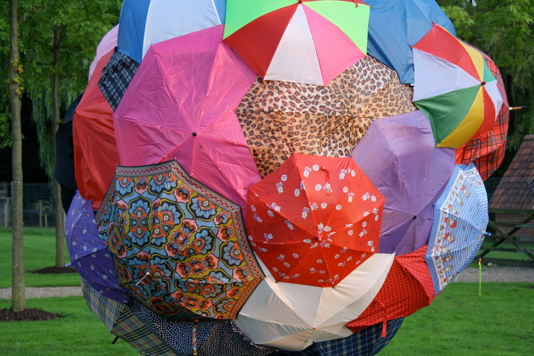 A playful take on the idea of a rain cloud, using umbrellas of varying patterns and colours to make a bright, vibrant, and fun 'cloud', removing the associations of anxiety and fear from the term.