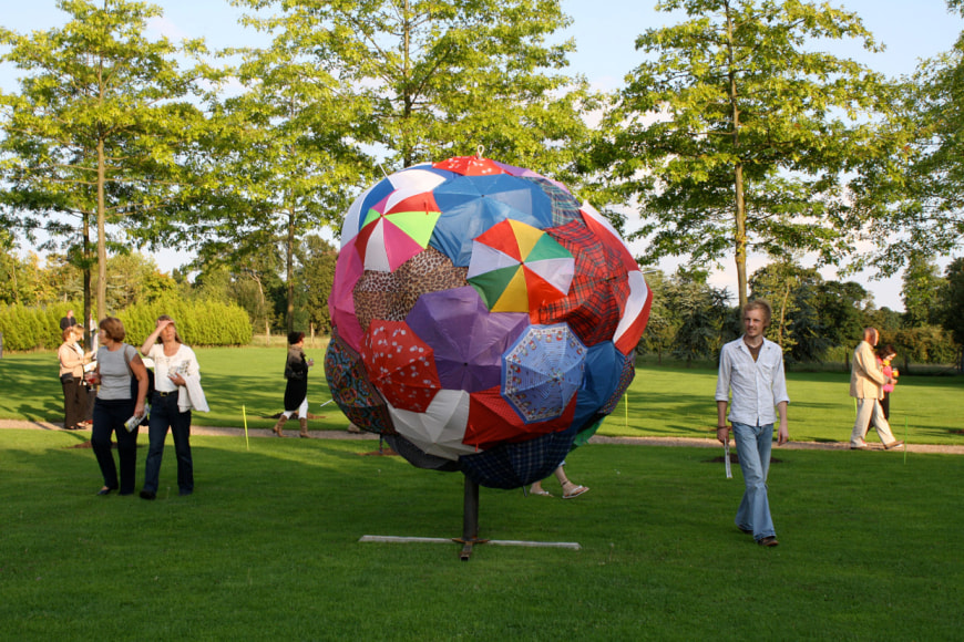A cluster of colour suspended on a pole, seemingly floating above the ground. Can be suspended up to 3m from the ground, thereby emphasizing the idea of a mass existing in the air.