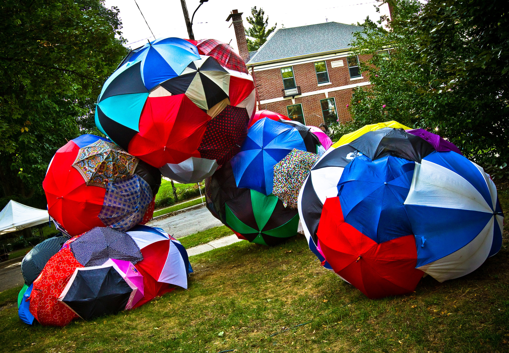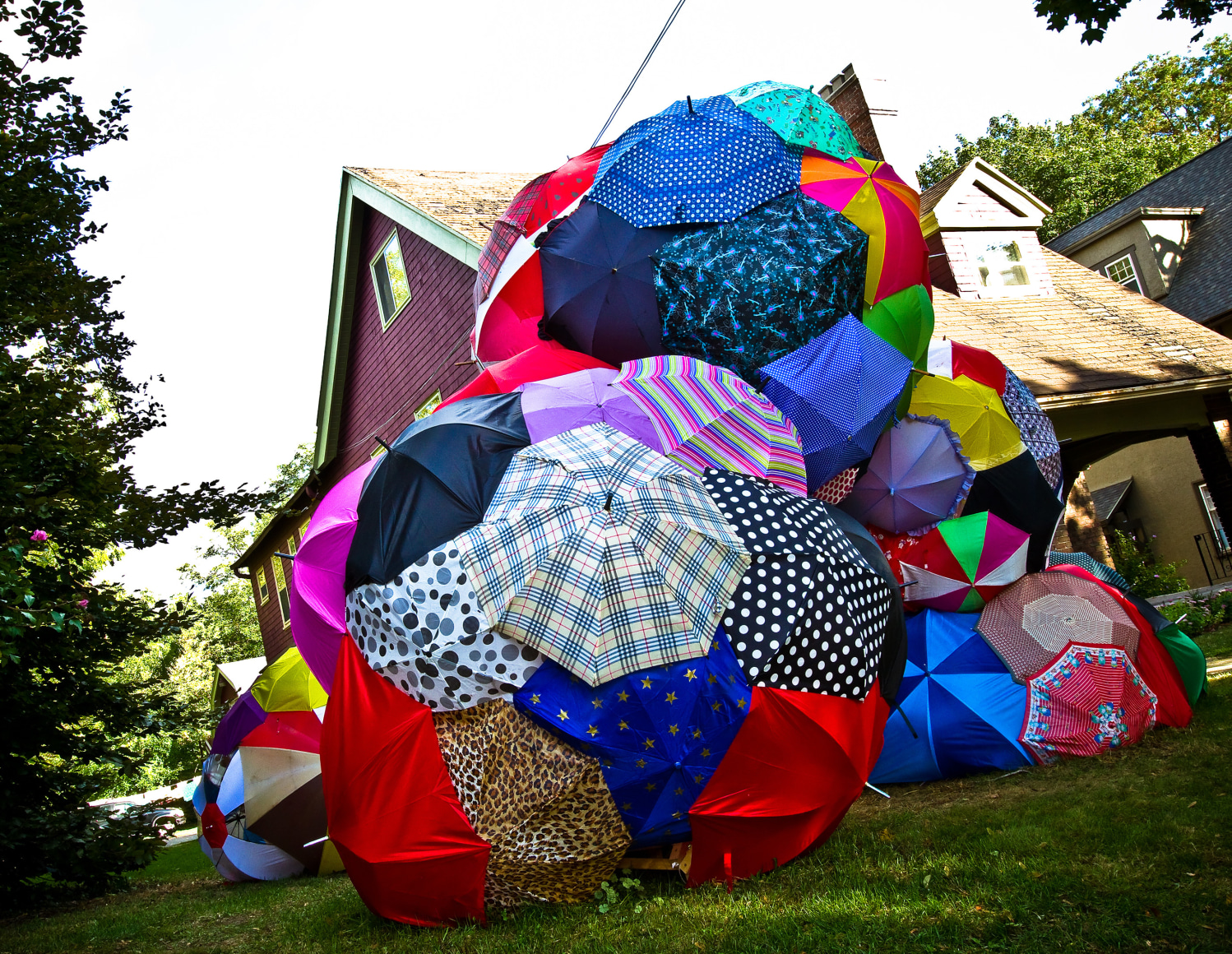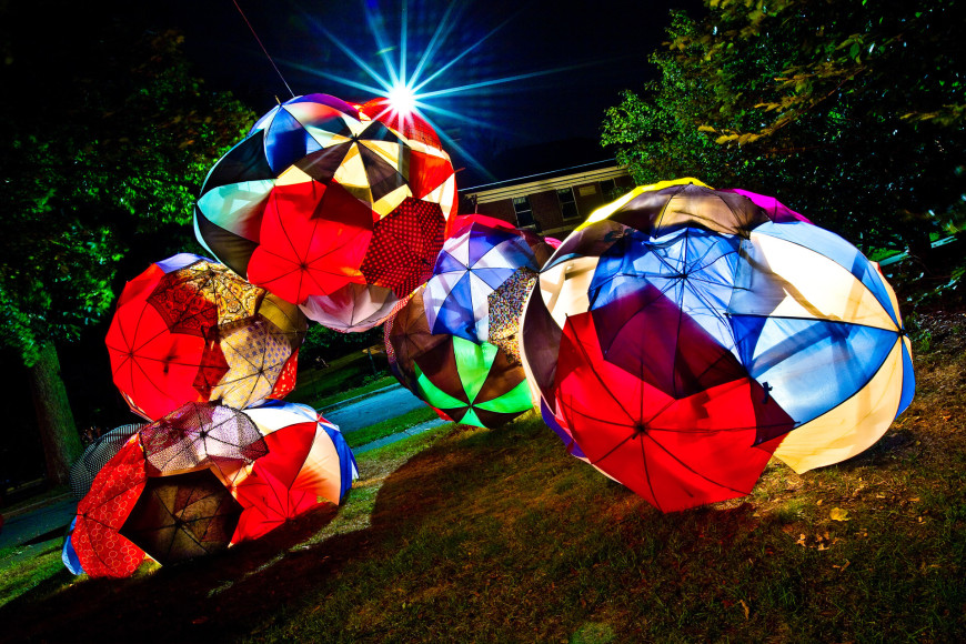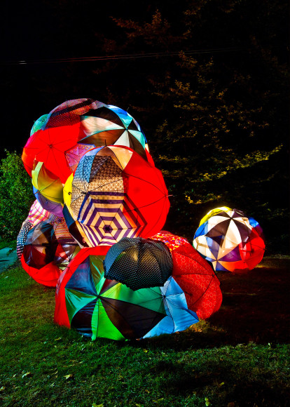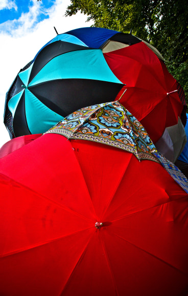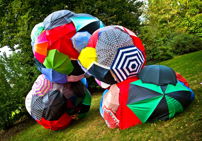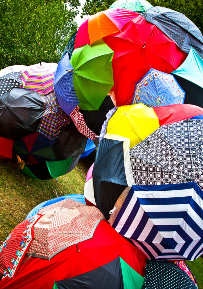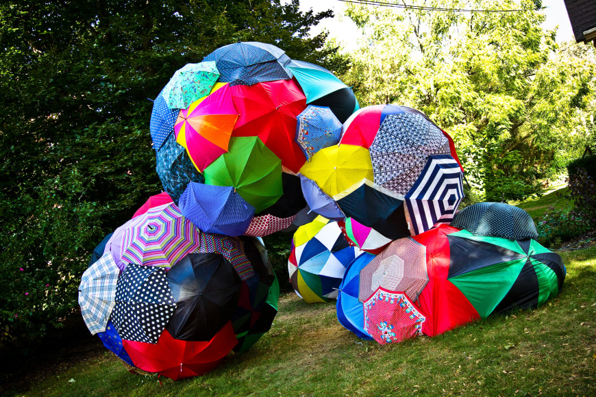 A further exploration of the idea of a rain cloud, focusing on the importance of community. Individually, the umbrellas are beautiful, but together they create a much more impactful and visually interesting work. The idea of the importance of community was further perpetuated by the fact that a significant portion of the umbrellas that make up 'Rain Cloud (Grand Rapids)' came from Grand Rapids locals, who donated umbrellas in varying states of disrepair. Using donated and broken umbrellas gives these items that would otherwise be destined for the trash a chance to tell another story and be appreciated for their aesthetic appeal. To add a sense of playfulness to the work, there were spaces left open where viewers could look into the sculpture, becoming more physically involved. For the more adventurous, some openings were located at the base of the sculpture, requiring the viewer to lie on the ground in order to look through them.