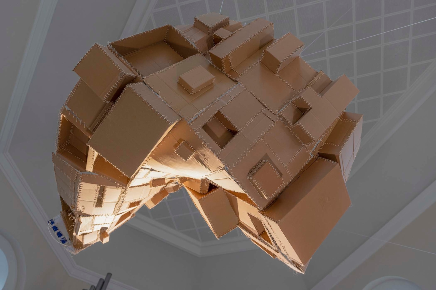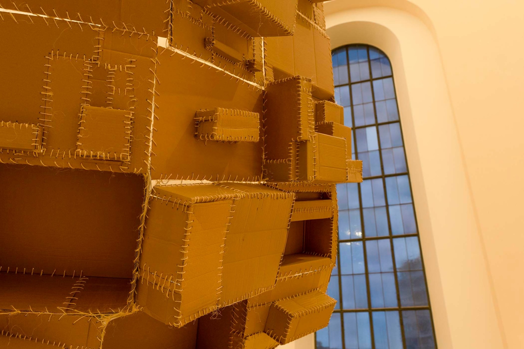 This project is also a continuation of the series, Wall Villages, inspired by cliff dwellings and the Adobe villages of the American Southwest created by folding and sewing cardboard boxes to create geometric yet organic shapes that nestle and stack together. The individual pieces are then joined together to create an abstracted reference to a village.