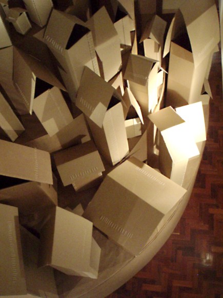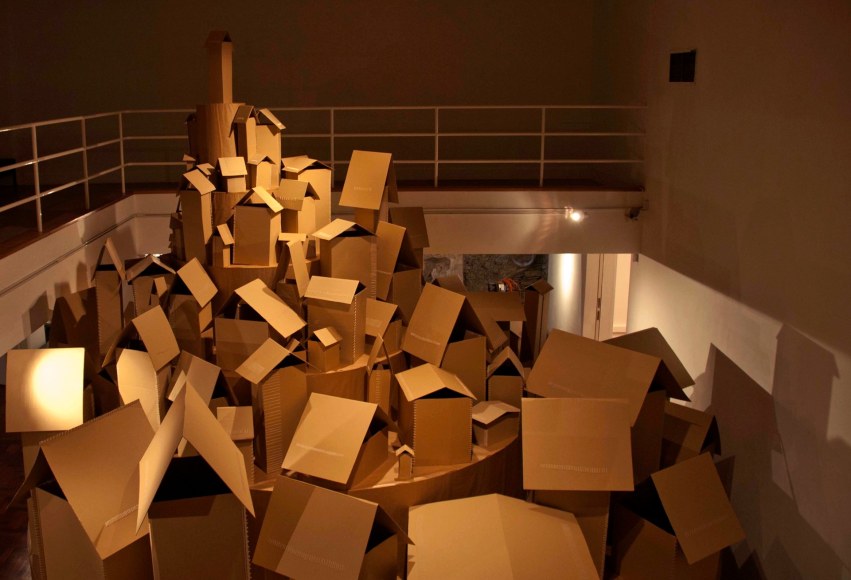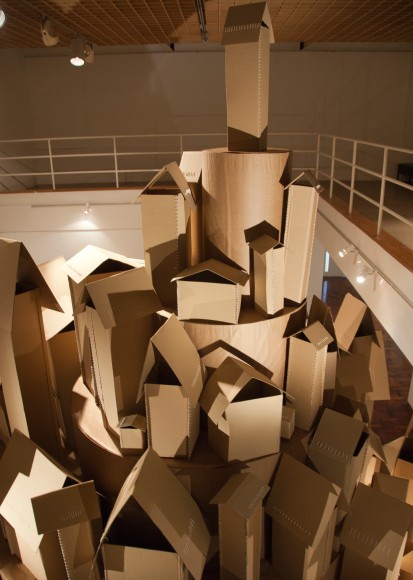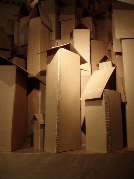 Sewing cardboard using cotton twine, a village was made, commenting on community and isolation. An everyday material was given significance that it does not normally possess, and used to engage a space and the people moving through it.