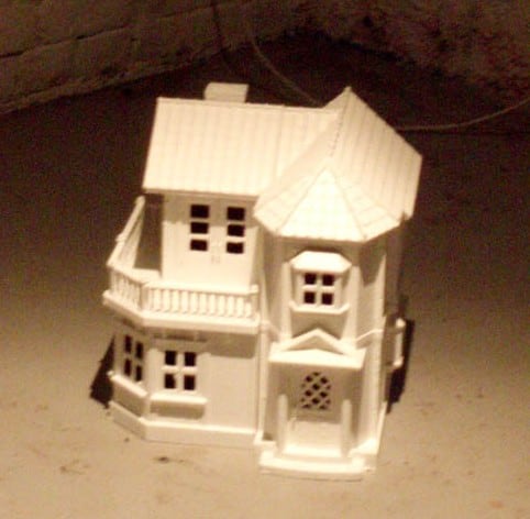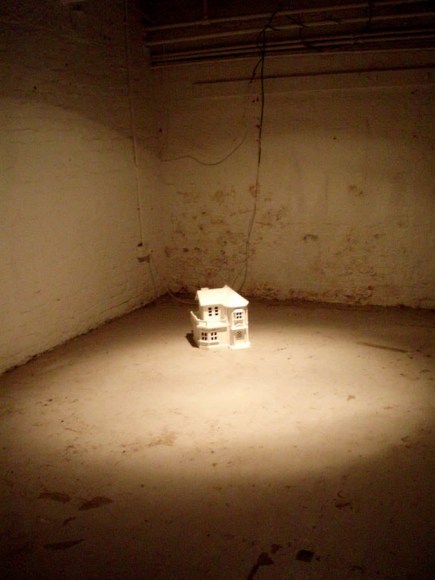 Situated in the corner of a dark cellar-like room, this installation was a quiet meditation on the dialogue between the security of home and the uncertainty of the world beyond. A single light bulb hanging over a pristine white dolls house gave this piece a haunting resonance as viewed by a single open door into the otherwise dark and windowless space surrounding.