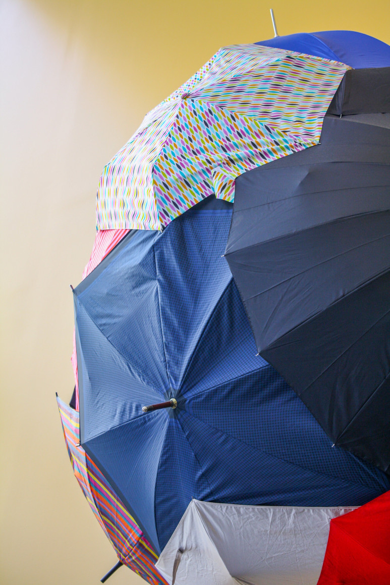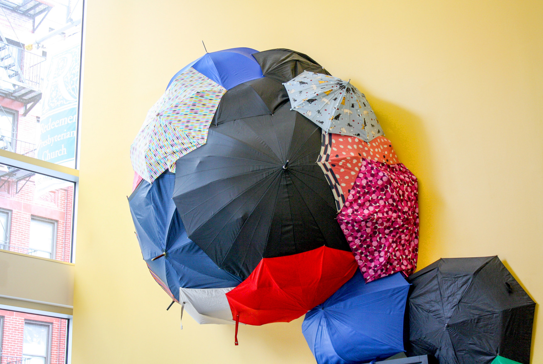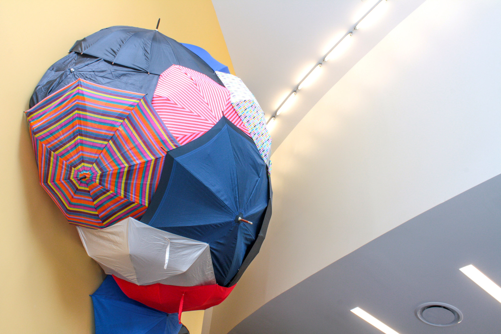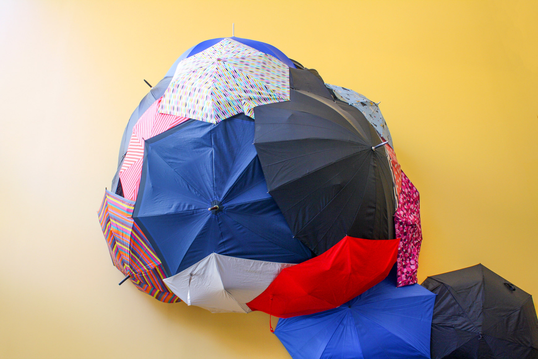 Rain Cloud (Wall Cloud, Manhattan) celebrates the beauty of community by using lost and found umbrellas. Individually beautiful but fragile, once combined these simple forms strengthen each other and create a visually powerful artwork. As well as celebrating community, this work highlights the beauty in everyday objects and gives these lost and broken umbrellas a chance at being seen in a new light.