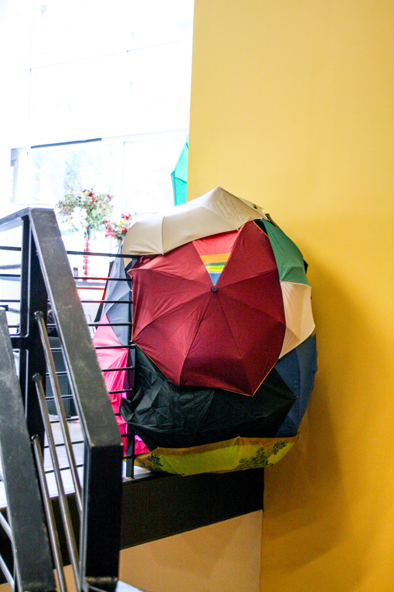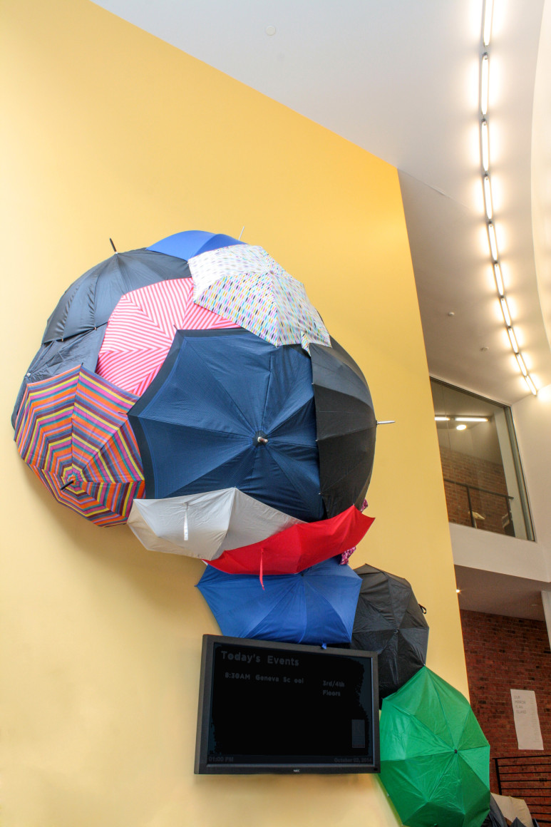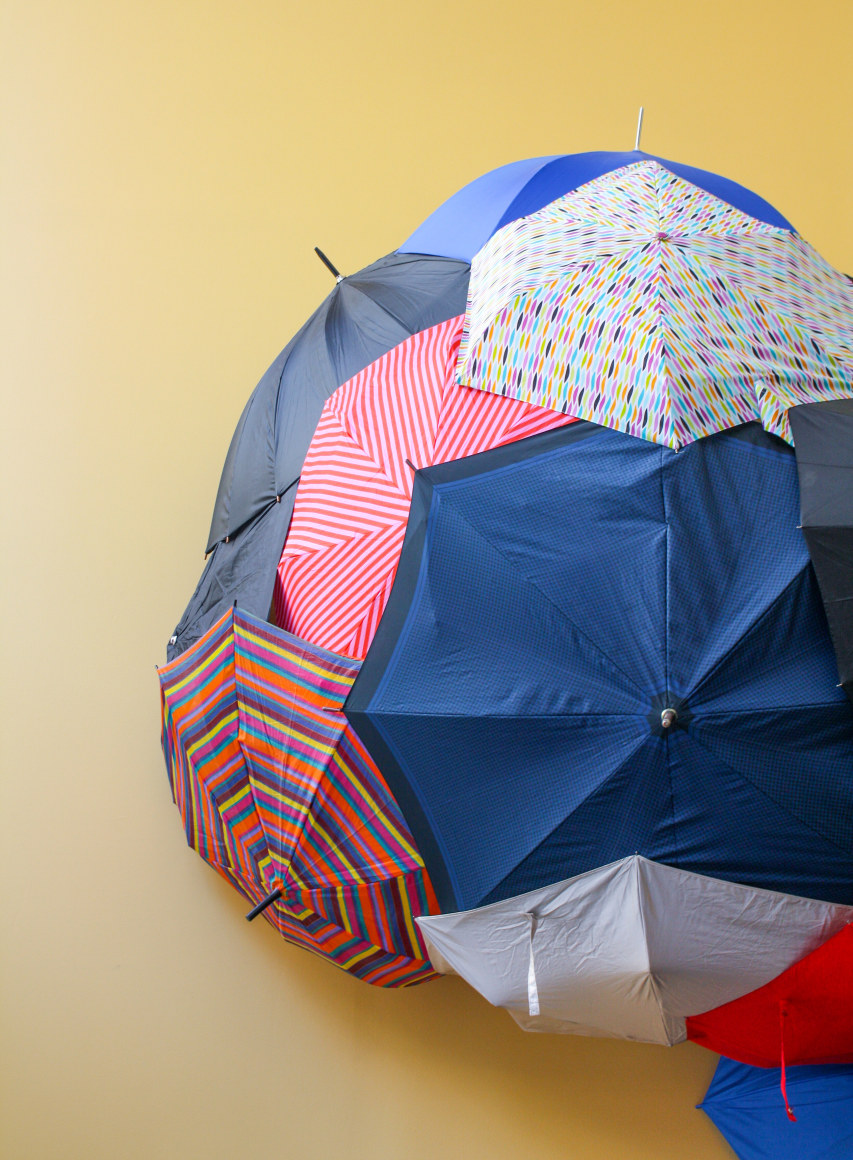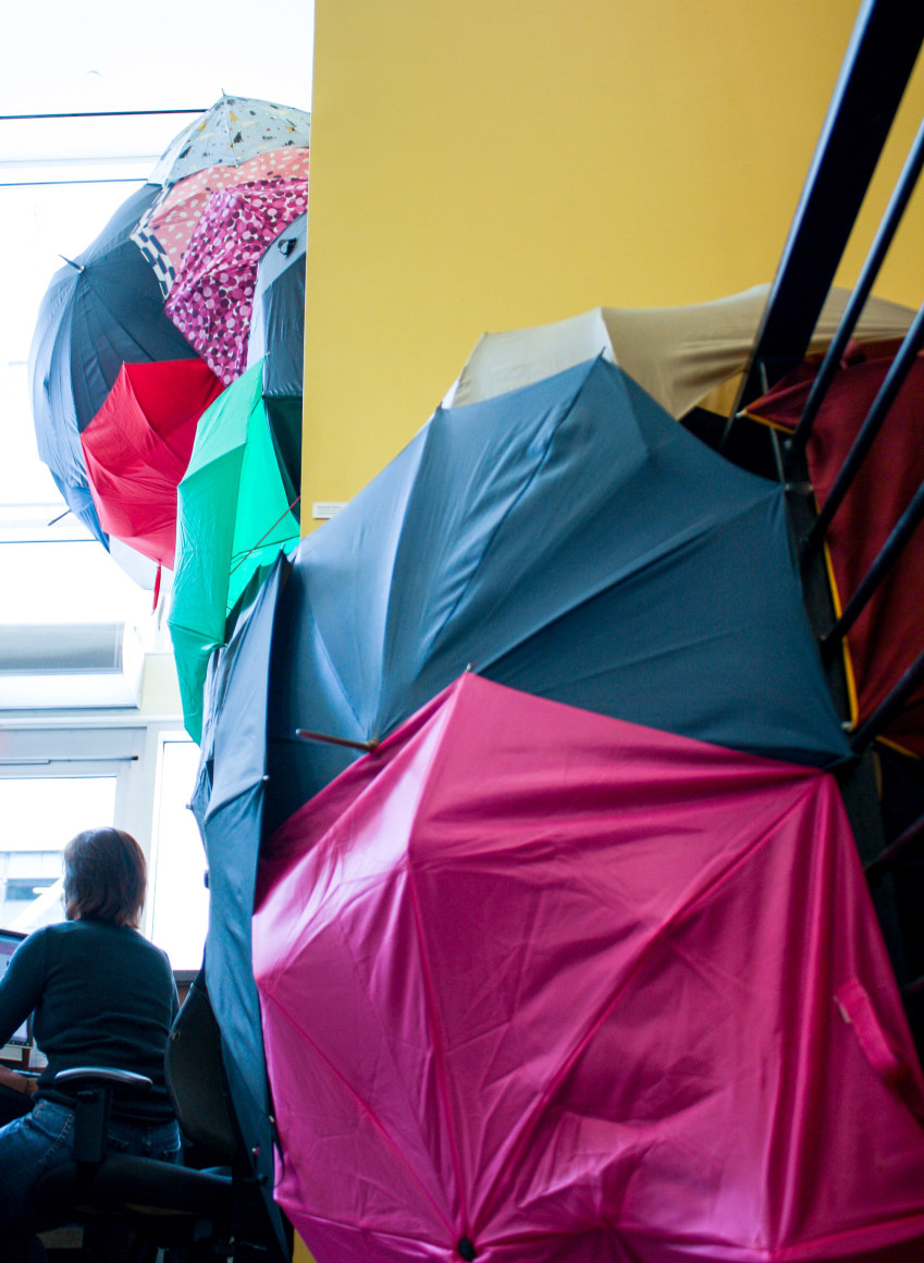 Rain Cloud (Wall Cloud, Manhattan) celebrates the beauty of community by using lost and found umbrellas. Individually beautiful but fragile, once combined these simple forms strengthen each other and create a visually powerful artwork. As well as celebrating community, this work highlights the beauty in everyday objects and gives these lost and broken umbrellas a chance at being seen in a new light.