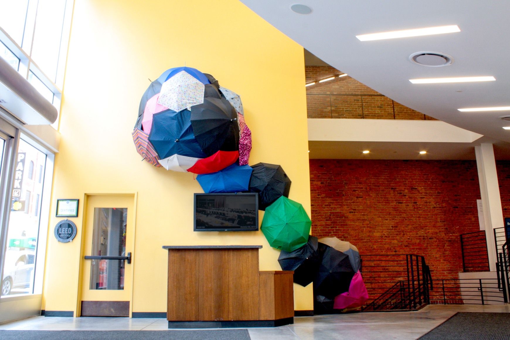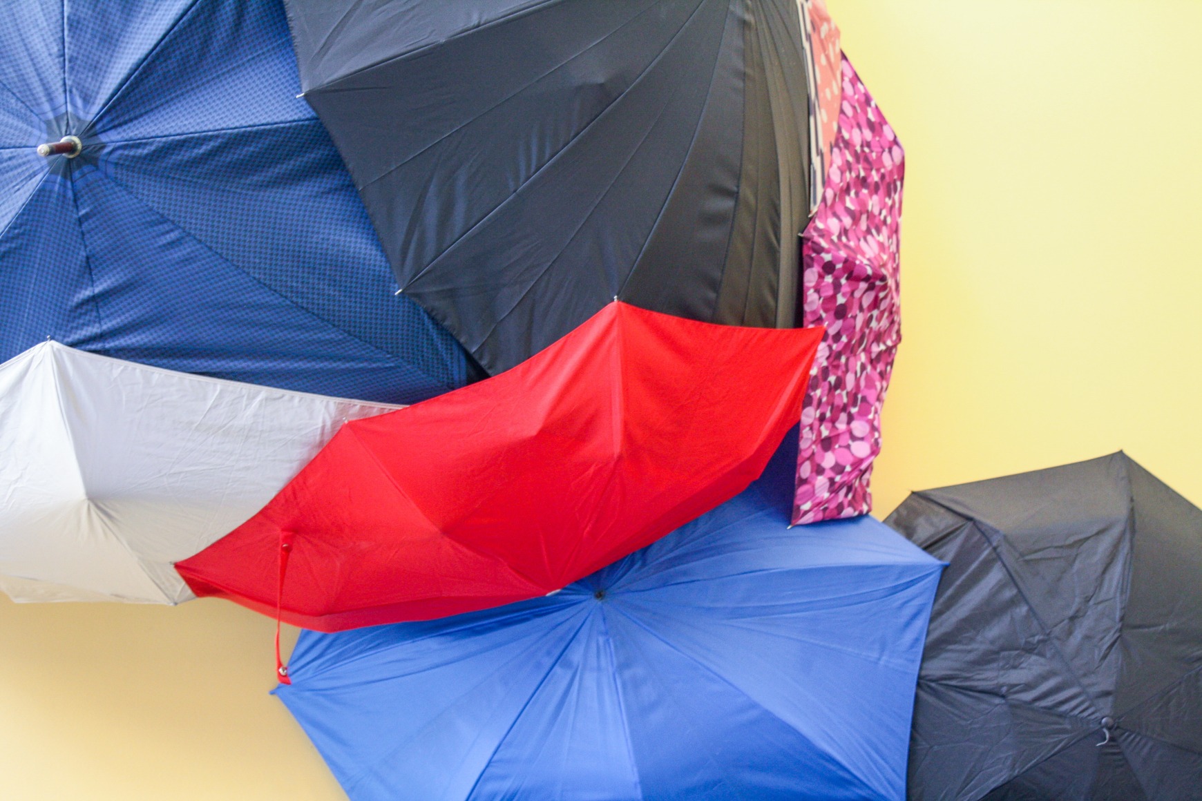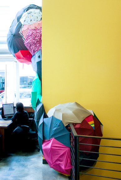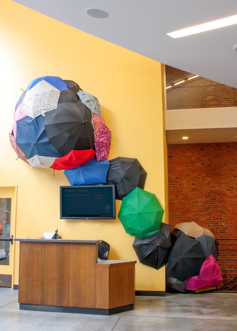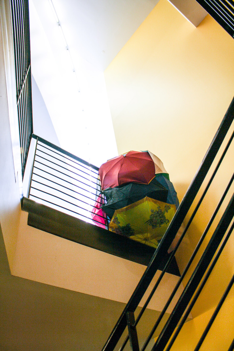 Rain Cloud (Wall Cloud, Manhattan) celebrates the beauty of community by using lost and found umbrellas. Individually beautiful but fragile, once combined these simple forms strengthen each other and create a visually powerful artwork. As well as celebrating community, this work highlights the beauty in everyday objects and gives these lost and broken umbrellas a chance at being seen in a new light.
