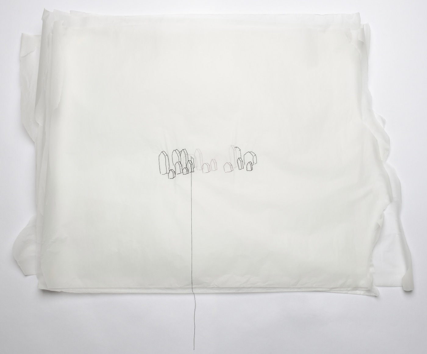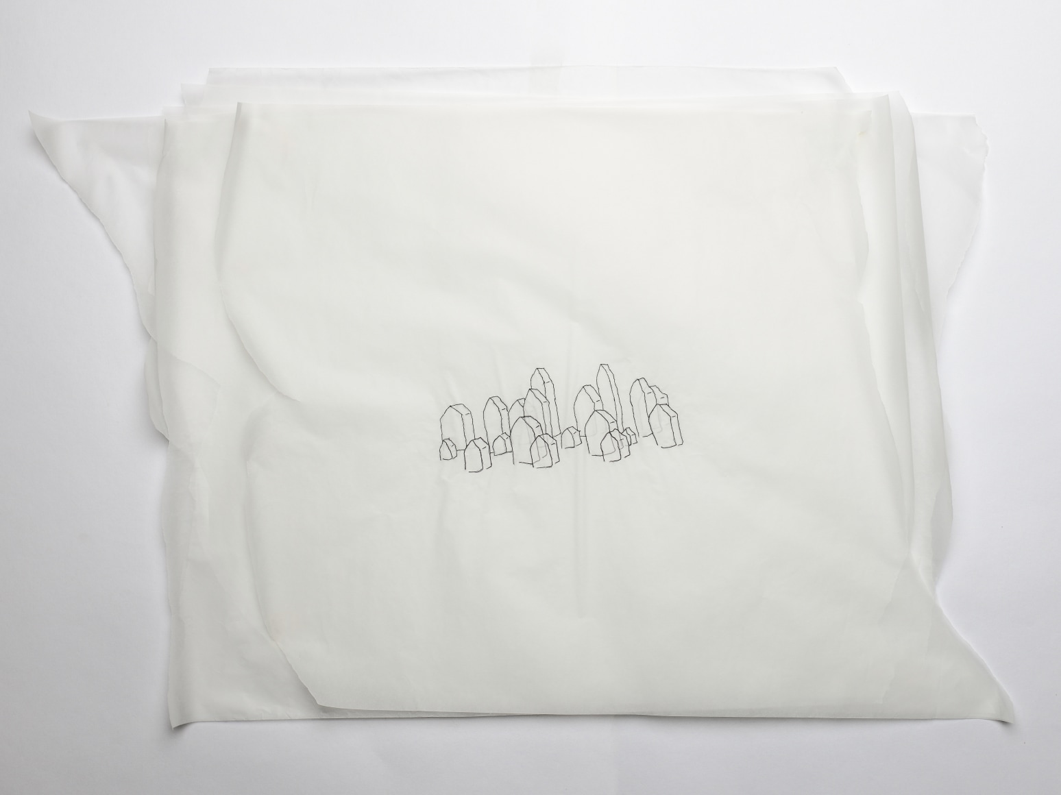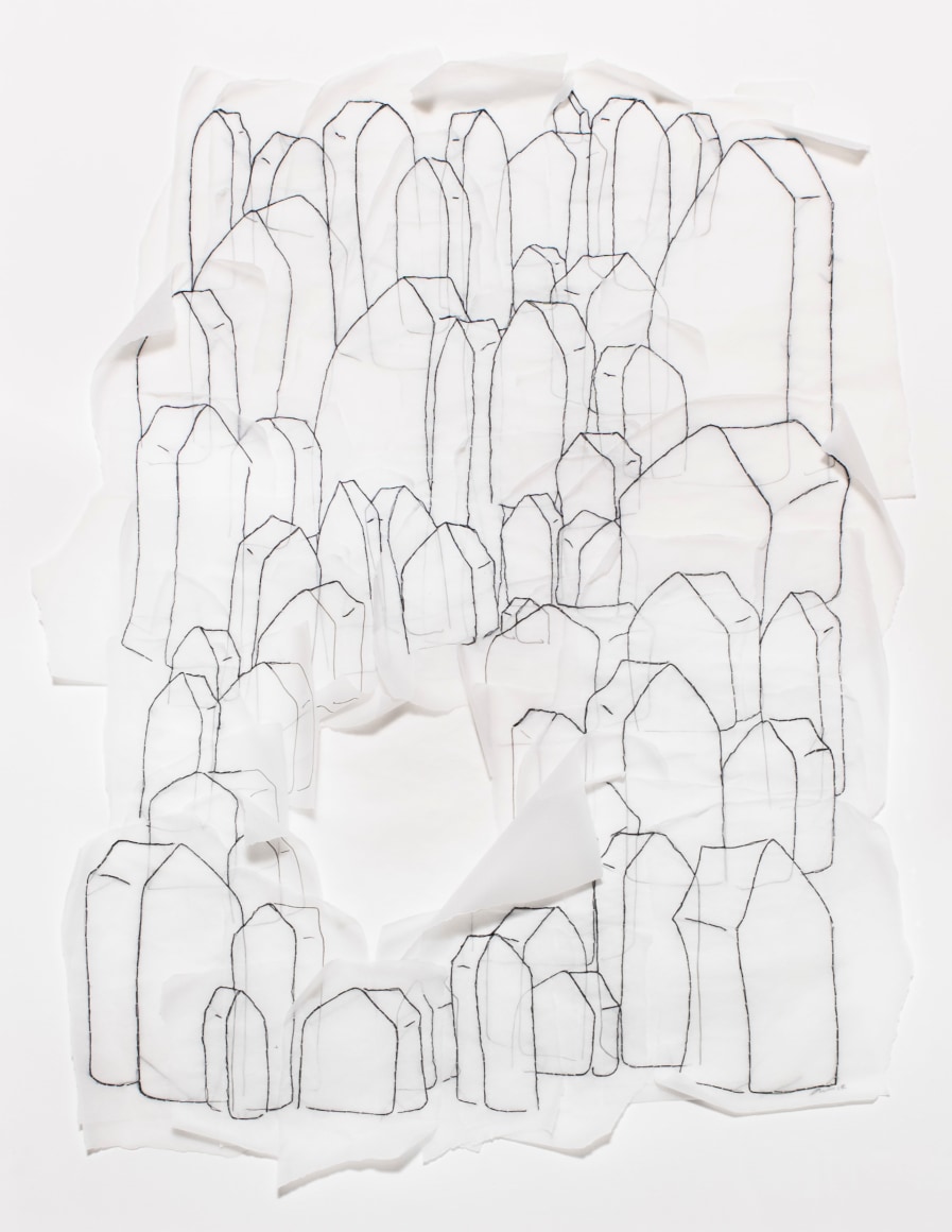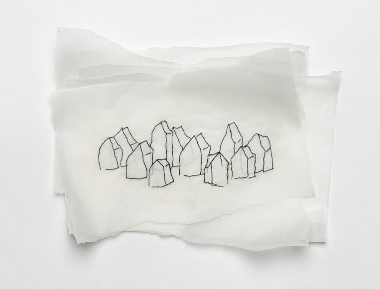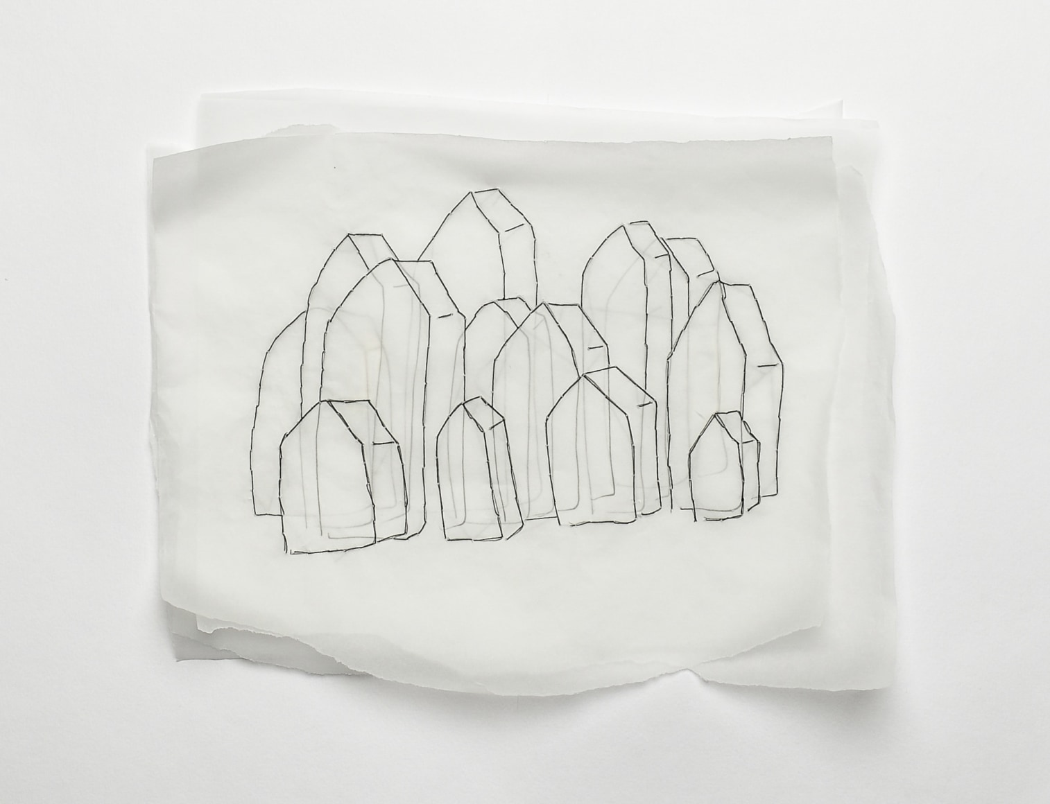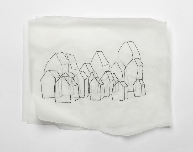 Untitled (Sewn) explores ideas of seeking shelter and belonging by sewing through layers of simple line drawings on tracing paper. In sewing these drawings together, the individuals are at once separate yet joined. The transparency of the paper serves to highlight the tension between the gathering and isolation present in these works.
