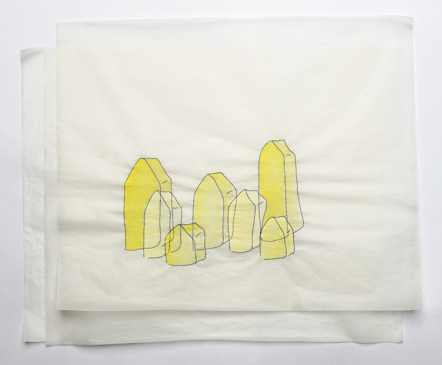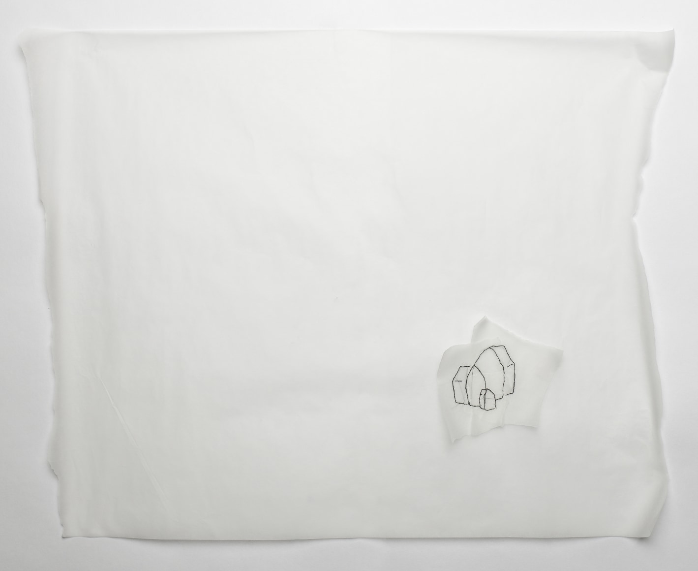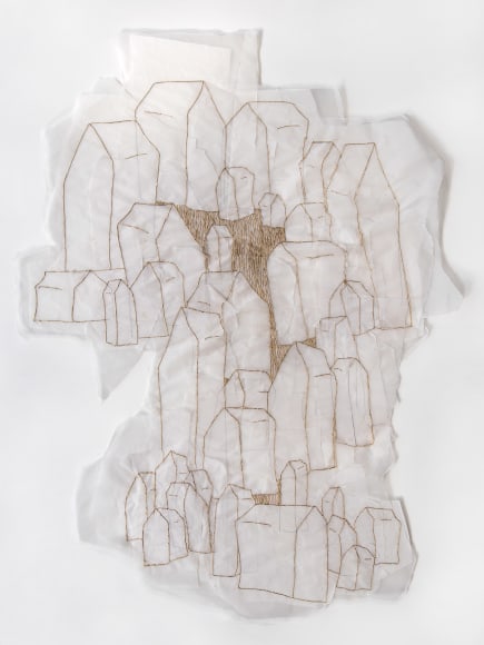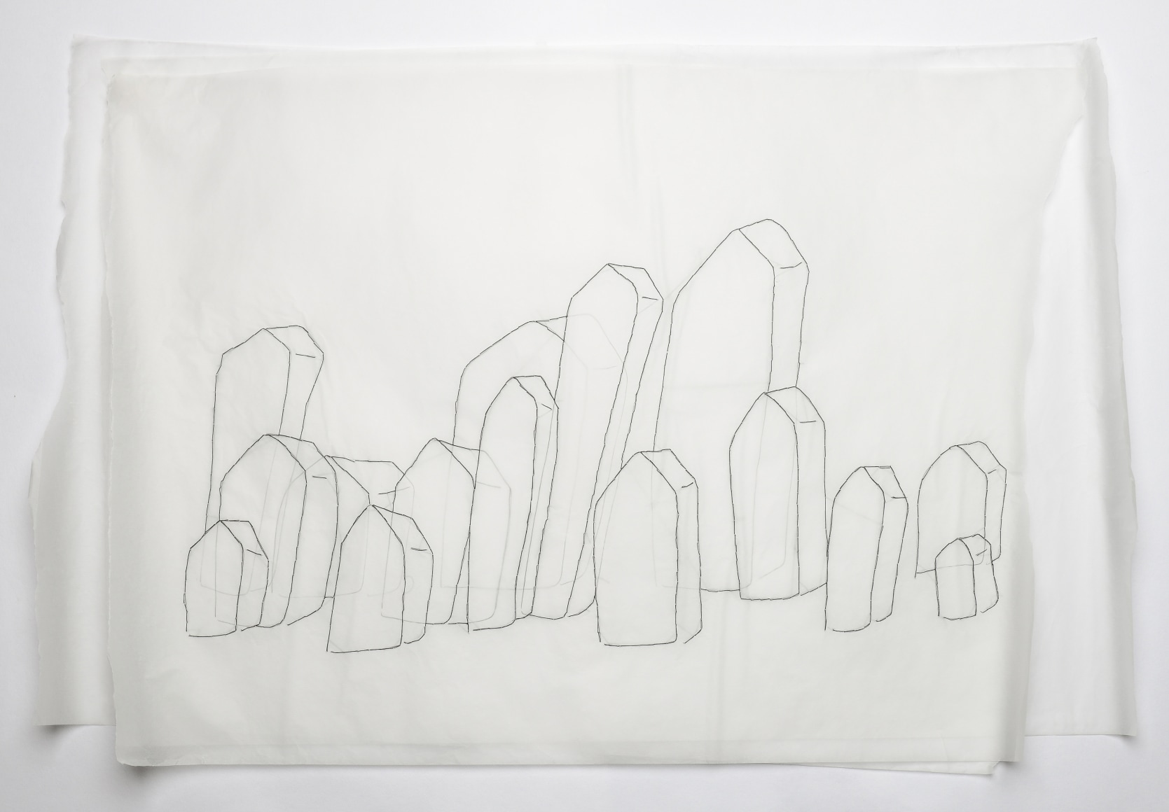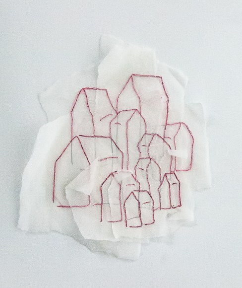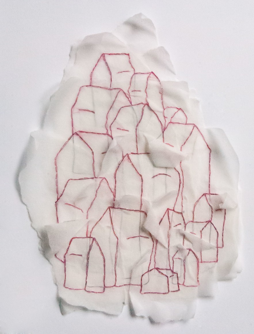 Untitled (Sewn) explores ideas of seeking shelter and belonging by sewing through layers of simple line drawings on tracing paper. In sewing these drawings together, the individuals are at once separate yet joined. The transparency of the paper serves to highlight the tension between the gathering and isolation present in these works.