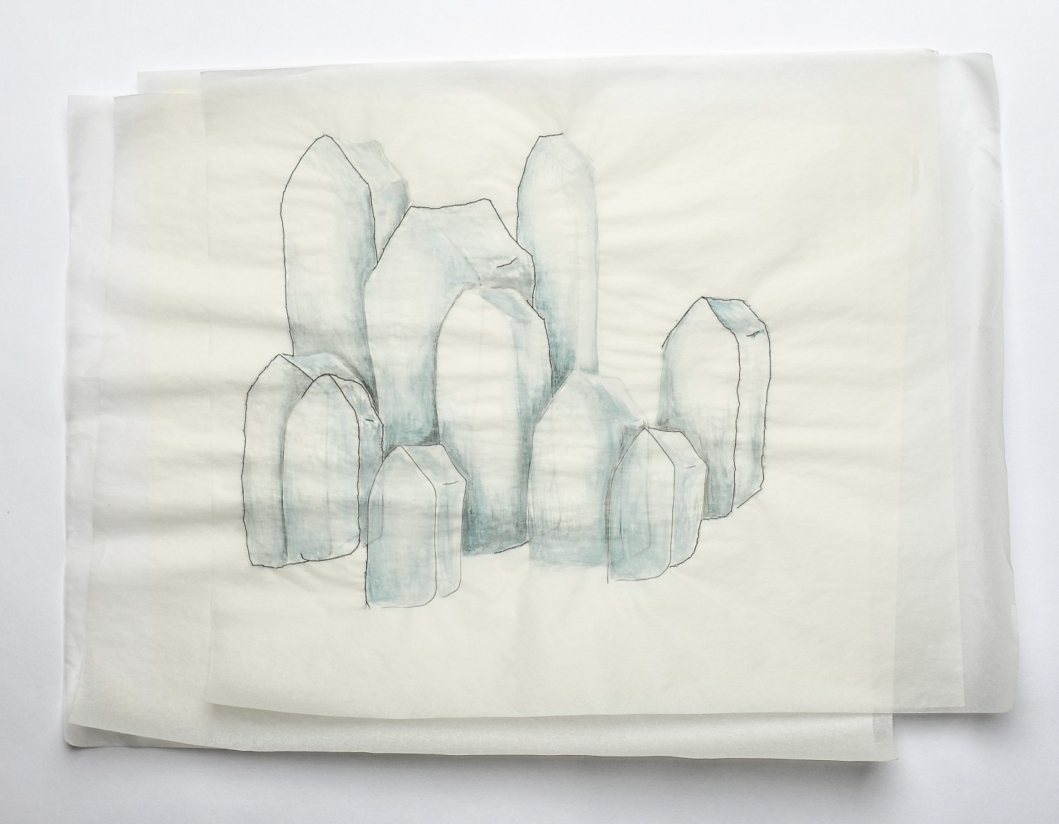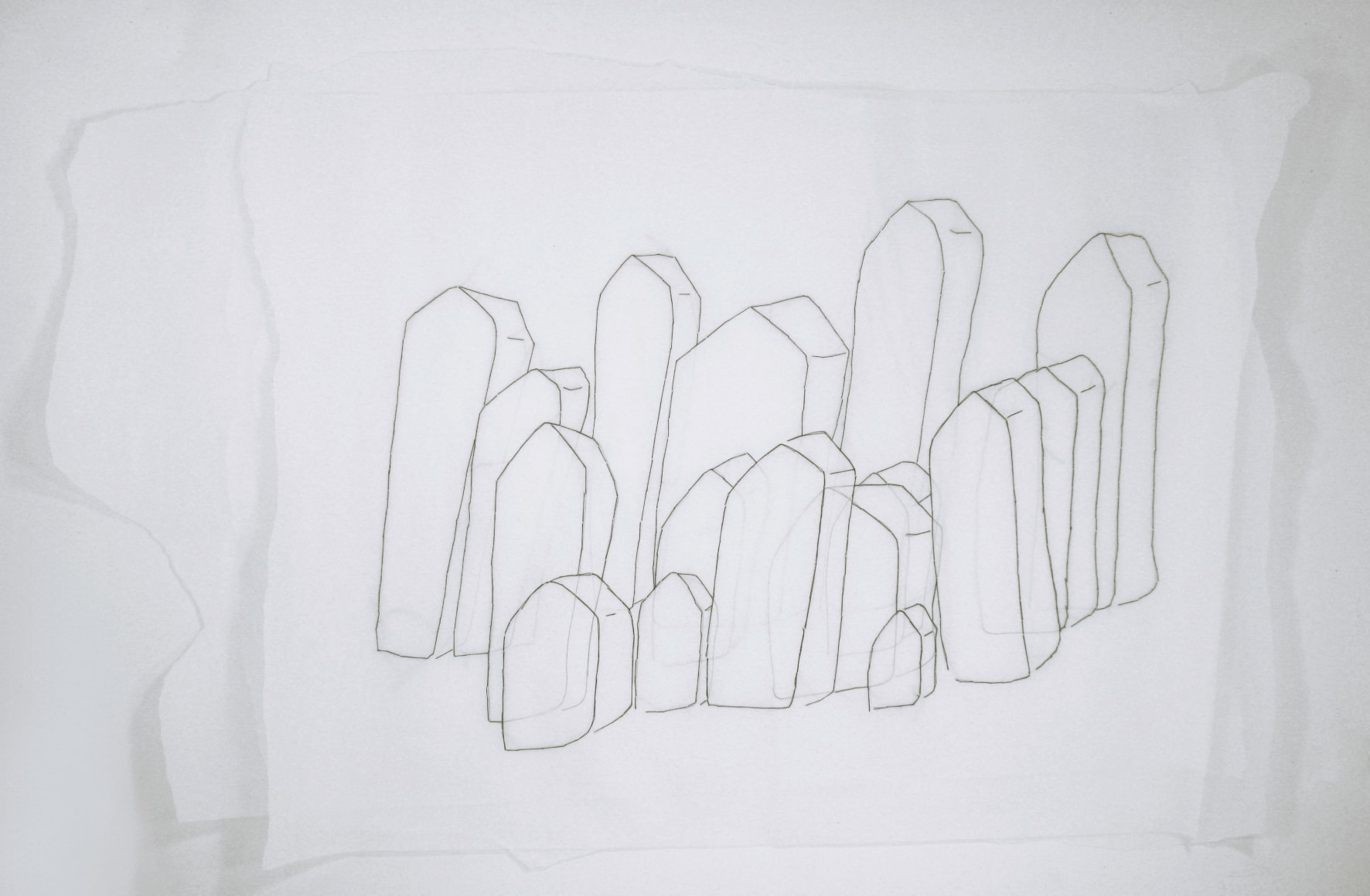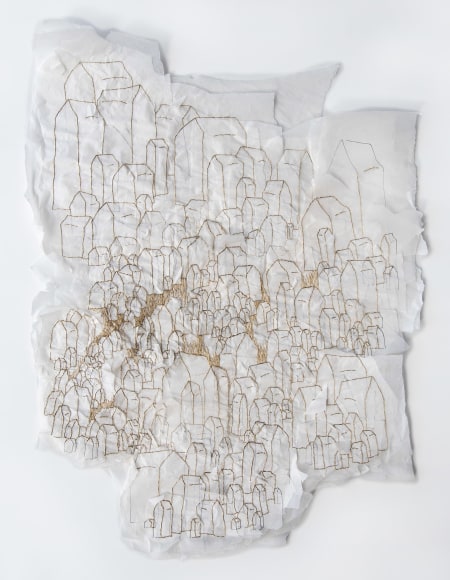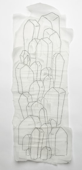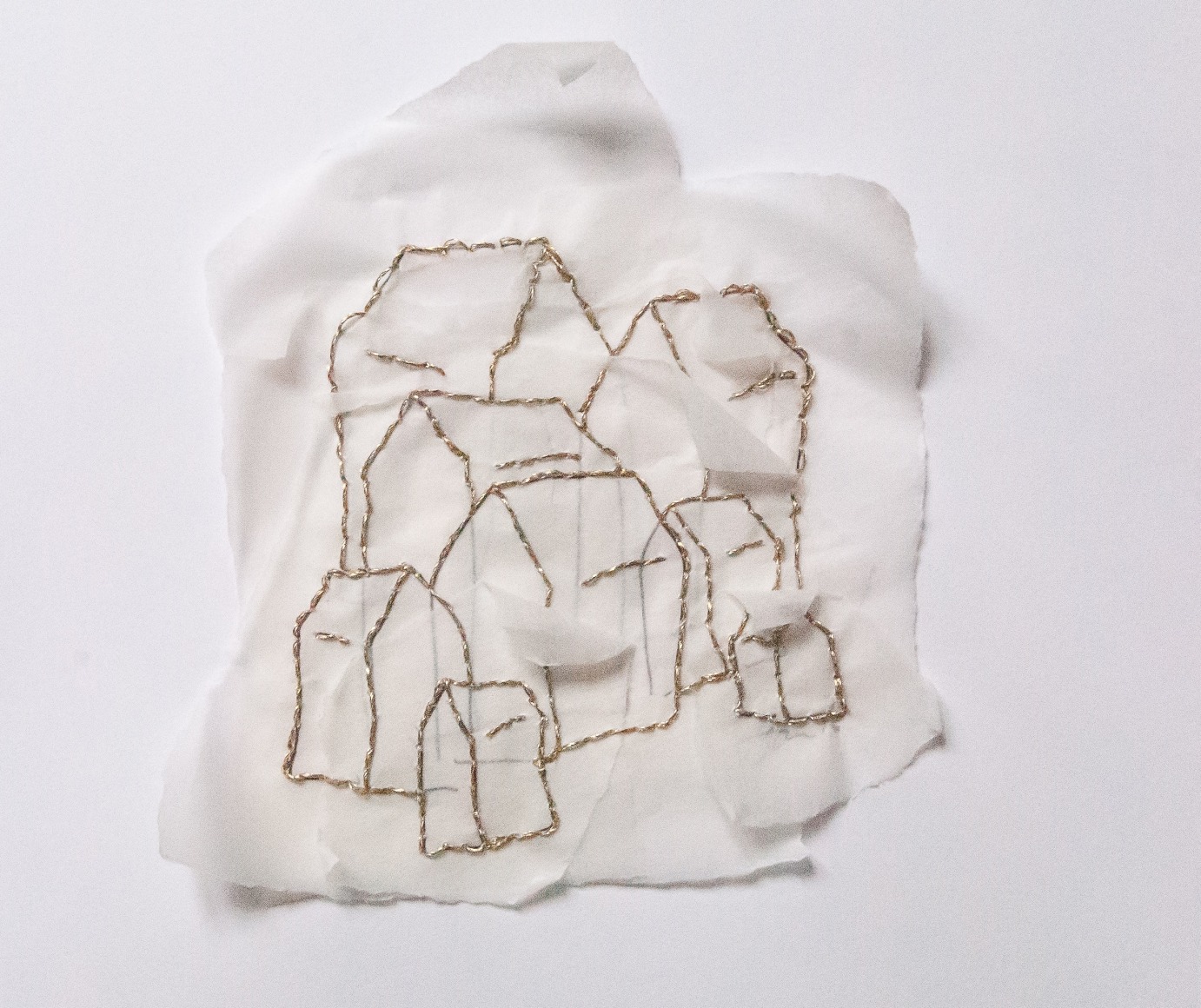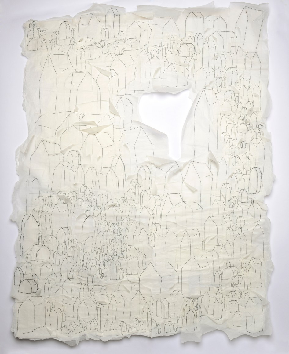 Untitled (Sewn) explores ideas of seeking shelter and belonging by sewing through layers of simple line drawings on tracing paper. In sewing these drawings together, the individuals are at once separate yet joined. The transparency of the paper serves to highlight the tension between the gathering and isolation present in these works.