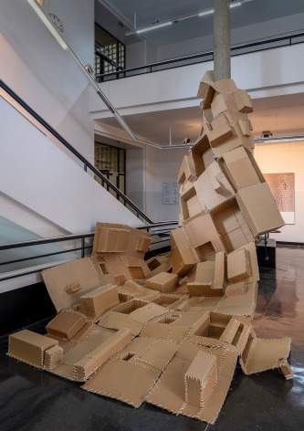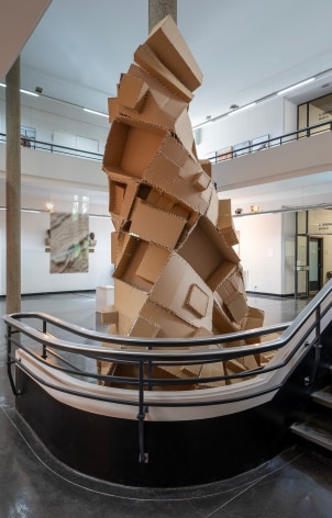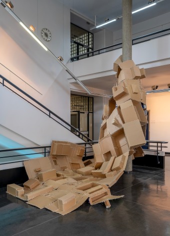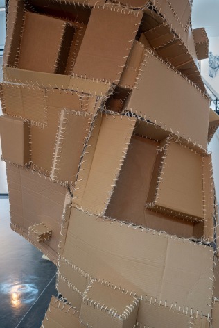 Interwoven cardboard boxes wind around a column and come to rest on the floor, evoking both the motion of departure and the calm of arrival. The material, commonly associated with transport and transition, is hand-sewn into a web-like structure that transforms rigidity into pliancy, the functional into the contemplative.